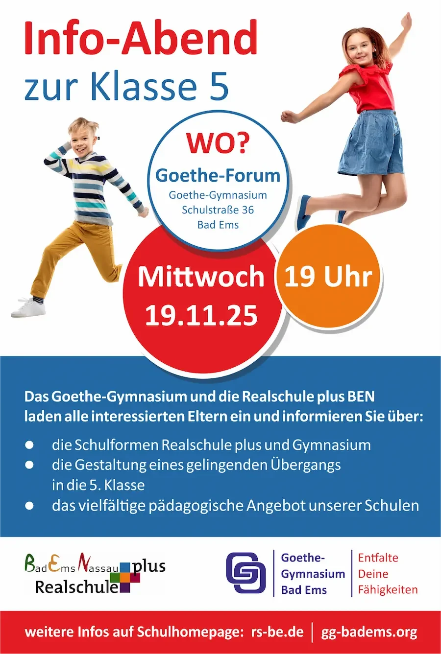Das Goethe-Gymnasium und die Realschule plus BEN laden alle interessierten Eltern zu einem Infoabend im Goethe-Forum des Goethe-Gymnasium in Bad Ems ein. Es wird informiert zu den Themen: